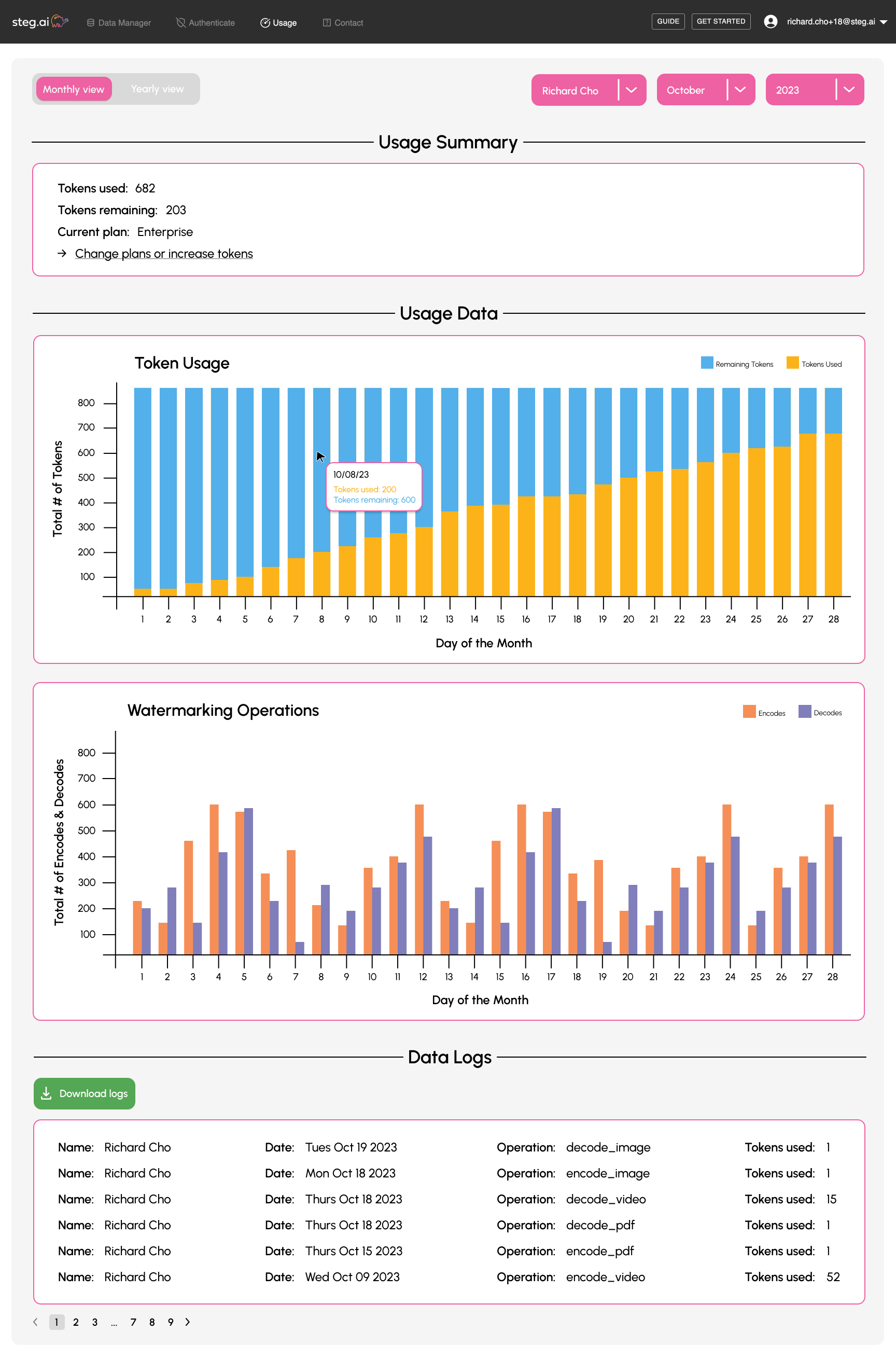 From stand ups with the team and weekly demos, I was able to get feedback to iterate over: Users can now easily upgrade their plans or tokens via a call-to-action link to remove friction in the upgrade process, filter even more of the data down to specific users in an organization's account, interact with the data visualizations through hover states, and see even more contextual details in the logs (specifically on who performed what action) with a better way to parse through the table using pagination.